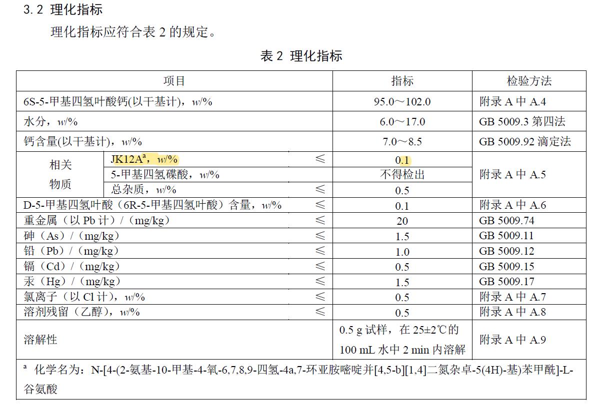 为了确保活性叶酸补充剂的安全性和有效性,严格控制JK12A的含量变得尤为重要。国际药典和标准机构已经对JK12A的含量进行了严格限制,以减少其可能带来的健康风险,如美国USP药典标准和世卫组织的JEFCA标准,均规定其含量不能超过1.0%。