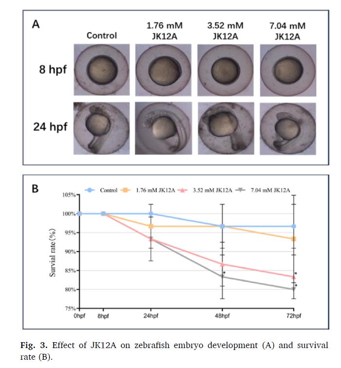 胚胎发育毒性:斑马鱼模型研究显示,JK12A对胚胎生长及心脏发育具有显著负面影响。随着暴露浓度的增加,胚胎存活率显著下降,心率减缓,体长增长受限,心脏发育相关基因(如has2、hand2、nkx2.5)的表达水平显著下调,可能影响心肌细胞的再生能力,最终危及胚胎的整体发育。