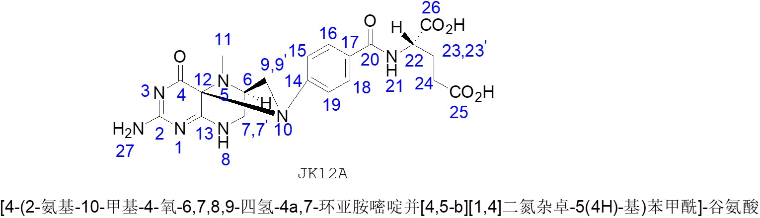 JK12A是5-甲基四氢叶酸(5-mTHF)的一种氧化产物,其化学结构为(4-((4aS,7R)-2-amino-10-methyl-4-oxo-3,6,7,8-tetrahydro-4a,7-epiminopyrimido[4,5-b][1,4]diazepin-5(4H)-yl)benzoyl)-L-glutamic acid)。