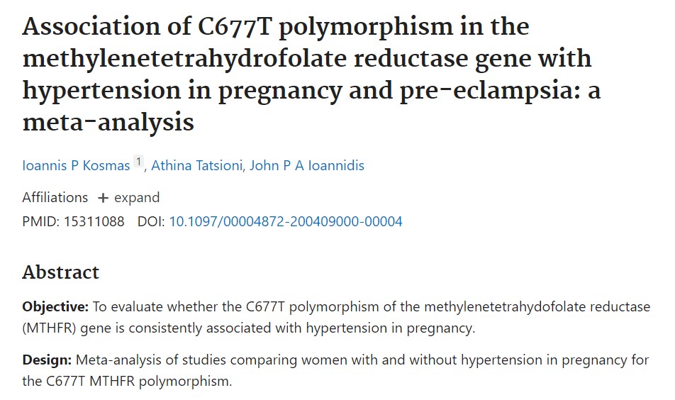 3.Kosmas, I. P., Tatsioni, A. T., & Ioannidis, J. P. A. Association of C677T polymorphism in the methylenetetrahydrofolate reductase gene with hypertension in pregnancy and pre-eclampsia: a meta-analysis. Journal of Hypertension, 2004; 22(9): 1655–1662. https://doi.org/10.1097/00004872-200409000-00004.