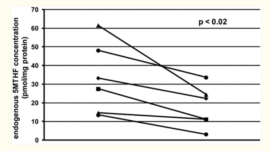 更让人细思极恐的是长期实验结果:当 HUVECs 在含 100nM 5-MTHF和 100nM 叶酸的混合培养基中连续培养 3 代后,细胞内 5-MTHF水平降低 47±21%(P=0.02)。这意味着,长期同时摄入叶酸和 5MTHF,细胞内超过四成的活性叶酸被「蒸发」掉了。