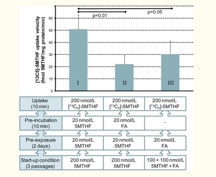 实验初期,研究者把人类脐静脉内皮细胞(HUVECs)置于含 200nM 5-MTHF 的培养基中正常培养。接着,为了模拟短期大量摄入叶酸的情景,他们向部分培养基中加入 20nM 叶酸并预孵育 10 分钟。仅仅 10 分钟后,奇迹 —— 或者说是「惊悚」发生了:细胞对 5-MTHF的摄取量骤降 57%(51±12 vs.22±7 fmol・min・mg protein,P=0.01)。