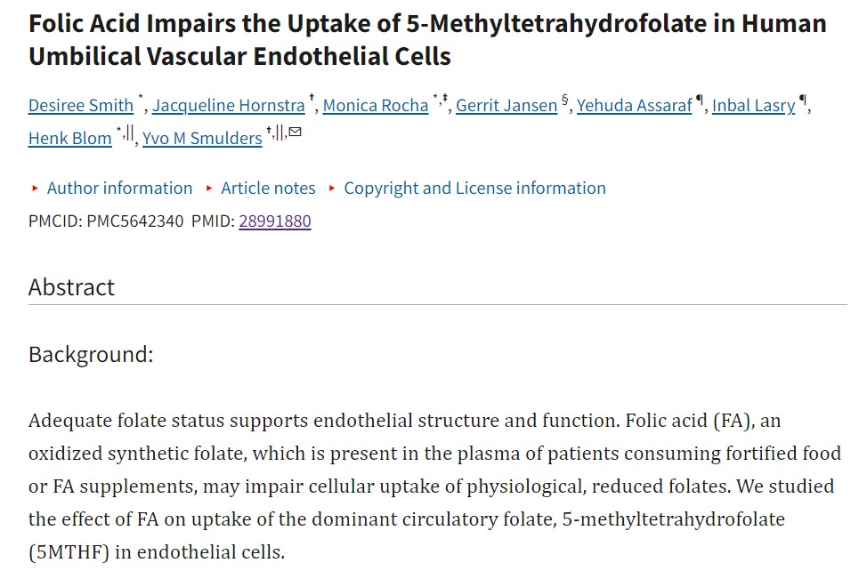 参考文献:[1]Folic Acid Impairs the Uptake of 5-Methyltetrahydrofolate in Human Umbilical Vascular Endothelial Cells[J].J Cardiovasc Pharmacol.2017 Oct;70(4):271-275. doi:10.1097/FJC.0000000000000514.