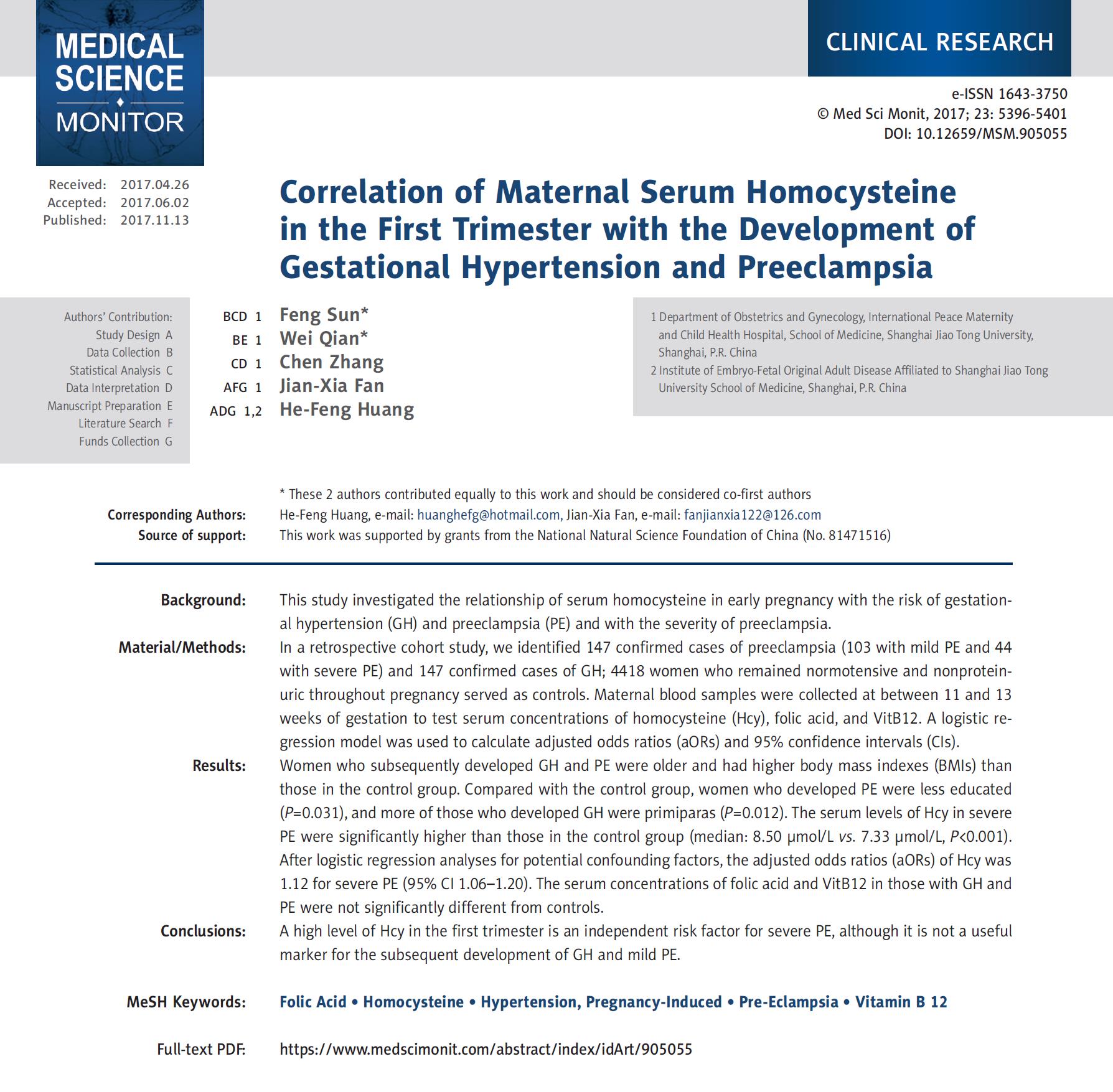 2.Sun F, Qian W, Zhang C, Fan JX, Huang HF. Correlation of maternal serum homocysteine in the first trimester with the development of gestational hypertension and preeclampsia. Med Sci Monit. 2017 Nov 13;23:5396-5401.