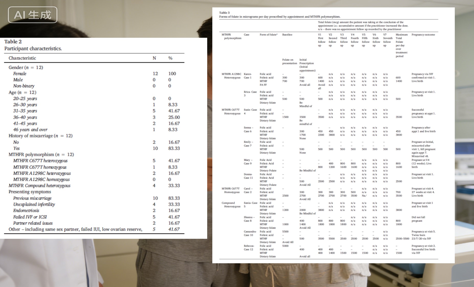 研究纳入的12名患者中,83.3%有流产史,41.7%经历过失败的辅助生殖周期,她们均确诊为MTHFR基因多态性(常见C677T杂合子、复合杂合子等类型)。对这些女性来说,每一次验孕棒的阴性,不止是数字的失落,更是身心的反复消耗。找到真正适合自己的营养方案,变得尤为迫切。