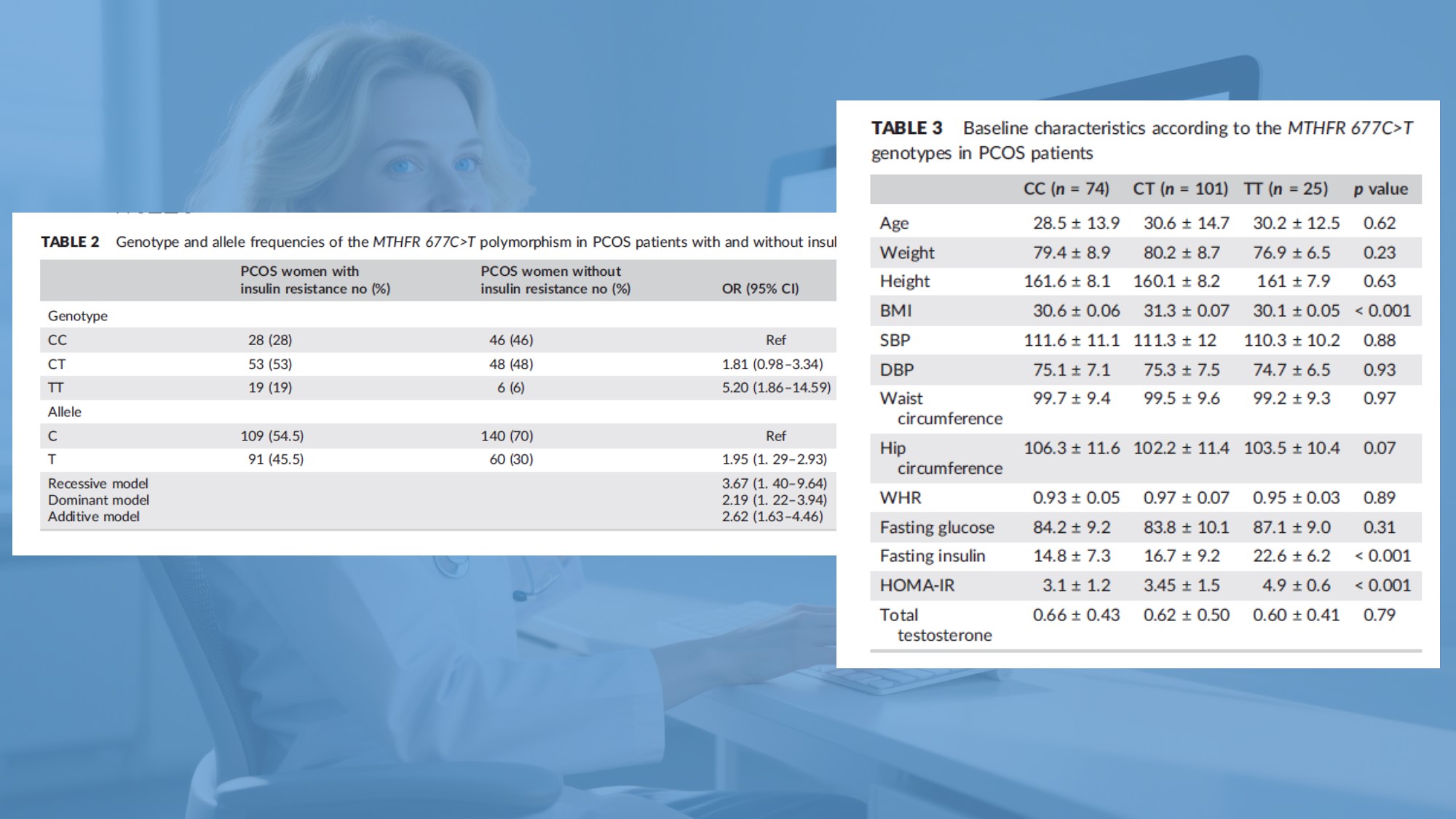 2019 年初,《Journal of Gene Medicine》上一项埃及的研究,把这种基因差异和健康风险直接连了起来。研究者选取了200例符合鹿特丹标准的PCOS女性,其中一半存在胰岛素抵抗,另一半无胰岛素抵抗,两组受试者的年龄和生活环境相似,且排除了药物、烟酒等干扰因素。通过PCR-RFLP方法检测发现,胰岛素抵抗组里,TT 基因型占了 19%,非 IR 组只有 6%——差了三倍多。换算成风险,TT 型发生 IR 的几率是其他型的5.2 倍,IR组中T等位基因频率为45.5%,显著高于非IR组的30%,各种遗传模型都指向同一个结论。作者明确指出,在埃及PCOS女性中,MTHFR 677C>T多态性是胰岛素抵抗的独立生物标志物。酶活性降低会导致同型半胱氨酸水平升高,进而引发代谢向不利方向发展。研究团队建议将MTHFR基因检测纳入PCOS代谢风险的早期评估体系,通过早期干预叶酸代谢异常,可能有助于预防糖尿病的发生。这揭示了一个常被忽视的盲点:不同个体对叶酸的代谢能力存在差异,部分人群因酶活性不足导致叶酸无法有效转化,仅在血液中循环而无法被利用。对于PCOS女性而言,若为TT或CT基因型,使用传统合成叶酸可能效果不佳,不仅无法有效提升体内叶酸水平,还可能增加代谢负担。