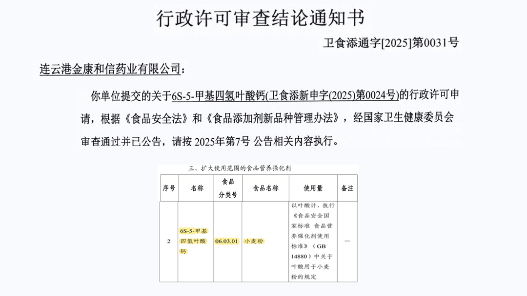 其一,是合规壁垒:2025 年之前,活性叶酸(6S-5 - 甲基四氢叶酸钙)未被国家批准用于小麦粉,企业想做也无法合法添加;而可添加的合成叶酸,却陷入 “能加却无效” 的尴尬,根本无法支撑商品化产品落地。直至 2025 年,国家卫健委正式批准叶源酸®(C 晶型)作为营养强化剂用于小麦粉,才从法规层面打通了市场化最后一公里。