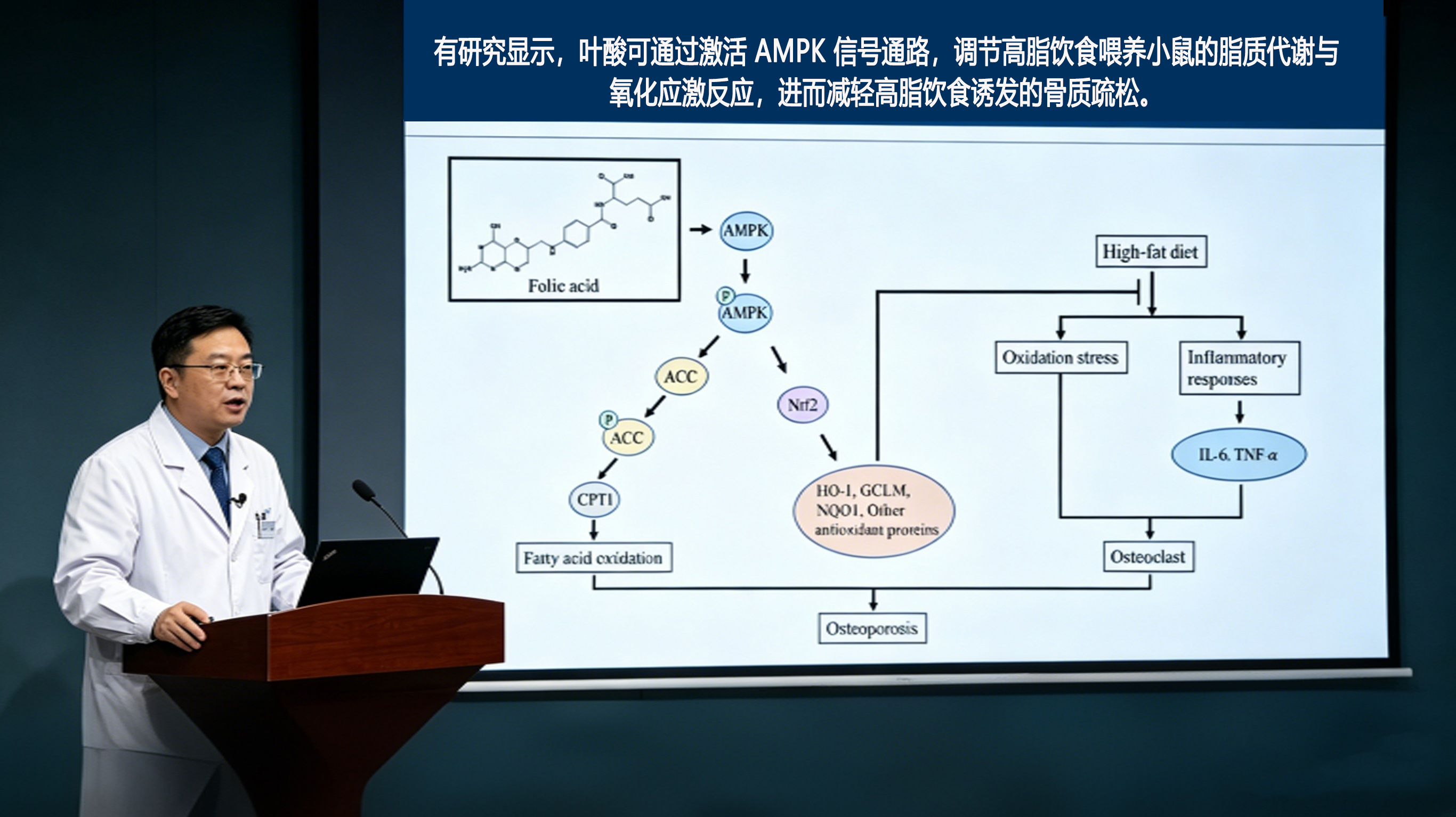 2022年,期刊细胞与发育生物学前沿刊登了一篇研究,标题是叶酸通过AMPK信号通路改善高脂饮食诱导骨质疏松。简单来说,吃太油会让骨头变脆弱,叶酸能缓解这个过程,背后通路叫AMPK。