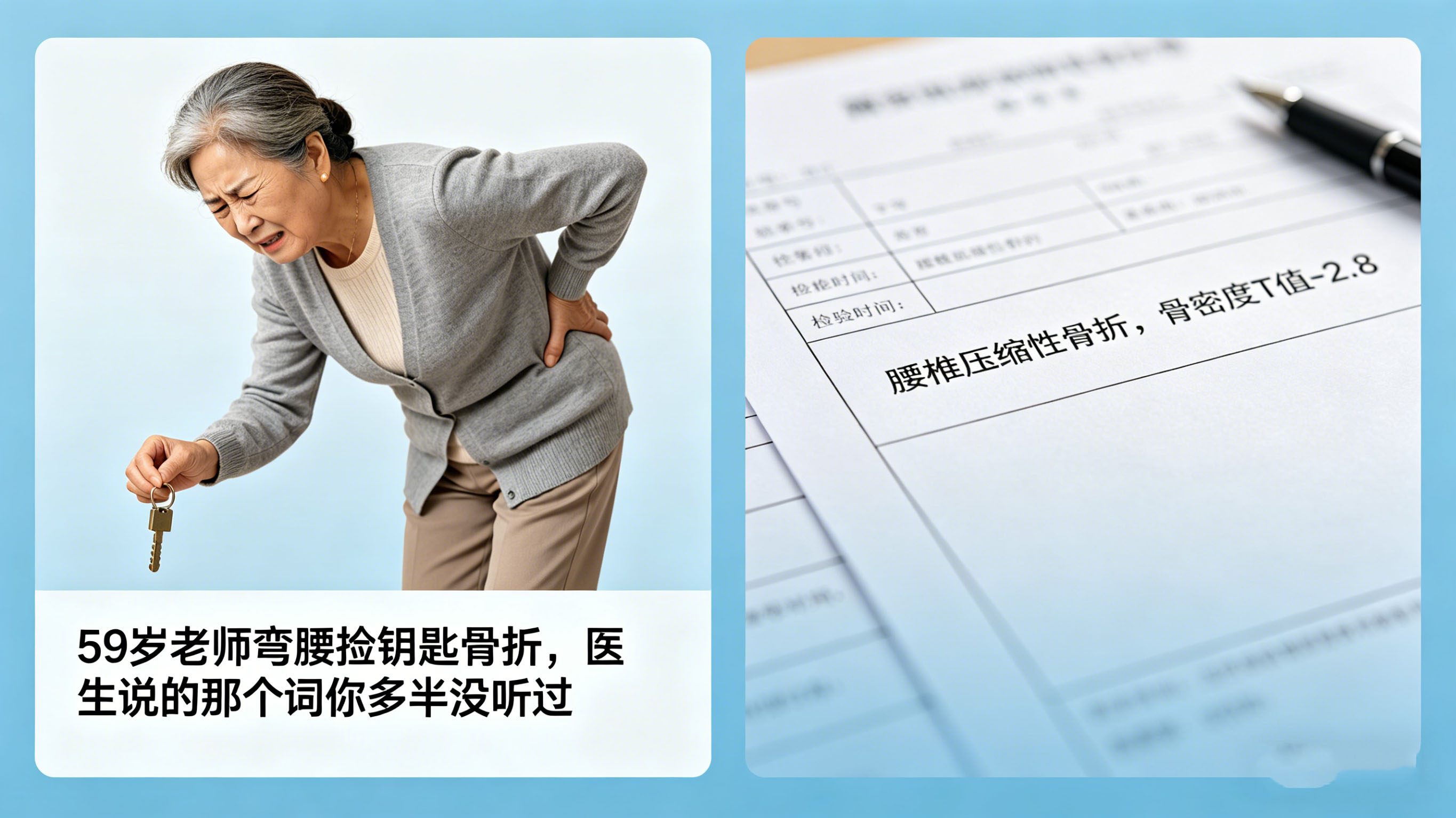王阿姨今年59岁,退休前在小学教语文,走路带风,身体一直不错。去年冬天弯腰捡了个钥匙,起身时腰背突然一阵剧痛。去医院拍片......