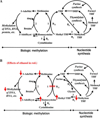 已有证据表明,急性和慢性酒精摄入对这种生化网络的主要影响是抑制蛋氨酸合酶(MS)催化的反应。在这个反应中,氰钴胺作为辅酶,5-甲基四氢叶酸(5-甲基四氢叶酸)作为底物。另一种底物,同型半胱氨酸,被重新甲基化形成蛋氨酸。乙醇对MS活性的抑制作用于20世纪60年代首次被观察到,此后几位研究者都证明了这一点。例如,在小猪模型中,观察到慢性(14周)和过量饮酒导致肝脏MS比活性降低35%。