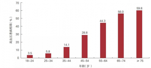 中国高血压调查(CHS)于2012~2015年采用分层、多阶段、随机抽样的方法在中国大陆31个省的262个城市和农村抽取451755名≥18岁居民进行调查,结果显示,中国成人高血压患病粗率为27.9%(年龄标化患病率为23.2%),男性高于女性(24.5% vs 21.9%),患病率随年龄增加而升高。