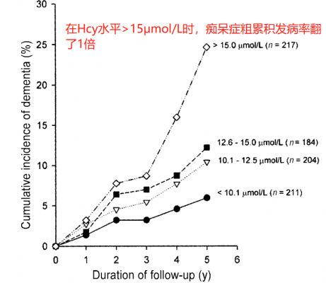 其中,26.6%的受试者存在高同型半胱氨酸血症。患有高同型半胱氨酸血症的人年龄更大,更有可能是女性、低B族维生素水平、经常吸烟、有中风和心血管病史疾病。这项前瞻性的基于意大利人群的研究表明高同型半胱氨酸血症使痴呆和AD的风险增加一倍。