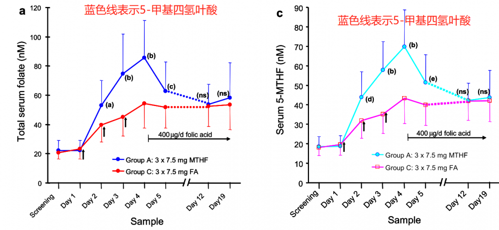 研究证明,服用7.5mg 5-MTHF剂量的妇女,在最初4天内血清总叶酸的增加要比相同的FA快得多。几乎所有服用7.5mg 5-MTHF(每12小时一次,共5次)的女性血清总叶酸几乎立即达到50nM。此外,随后给予0.4mg/d叶酸可维持这一水平。因此,5-MTHF使叶酸储存比FA更快、更均匀地充满,并且不产生未代谢的FA。