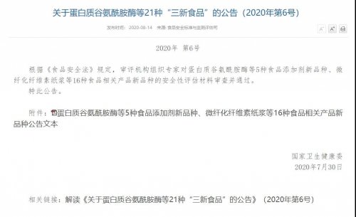 近日,国家卫生健康委发布《关于蛋白质谷氨酰胺酶等21种“三新食品”的公告》(2020年第6号),批准通过包括6S-5-甲基四氢叶酸钙(叶源酸)在内的21种“三新食品”。