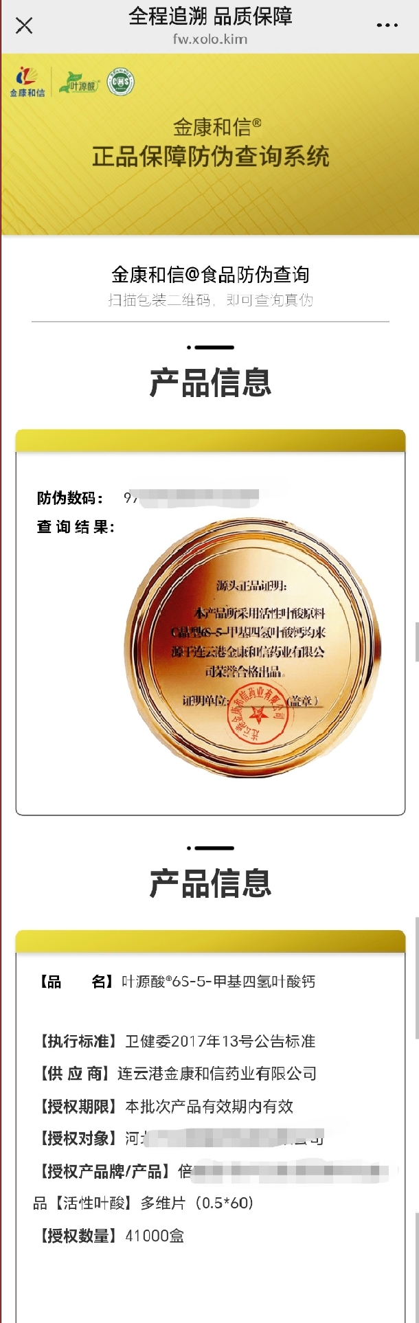 当前市场活性叶酸产品种类多样,产品品质与原料来源存在差异,消费者难以准确辨别。为保障消费者合法权益、提供正品核验渠道,金康和信作为专业活性叶酸源头生产企业,特发布本授权公示。