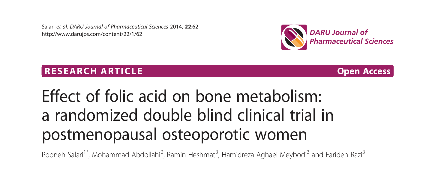 [2] Golbahar J, Hamidi A, Aminzadeh MA, Omrani GR. Effect of folic acid on bone metabolism: a randomized double blind clinical trial in postmenopausal osteoporotic women. DARU Journal of Pharmaceutical Sciences, 2014, 22(1). DOI: 10.1186/2008-2231-22-1